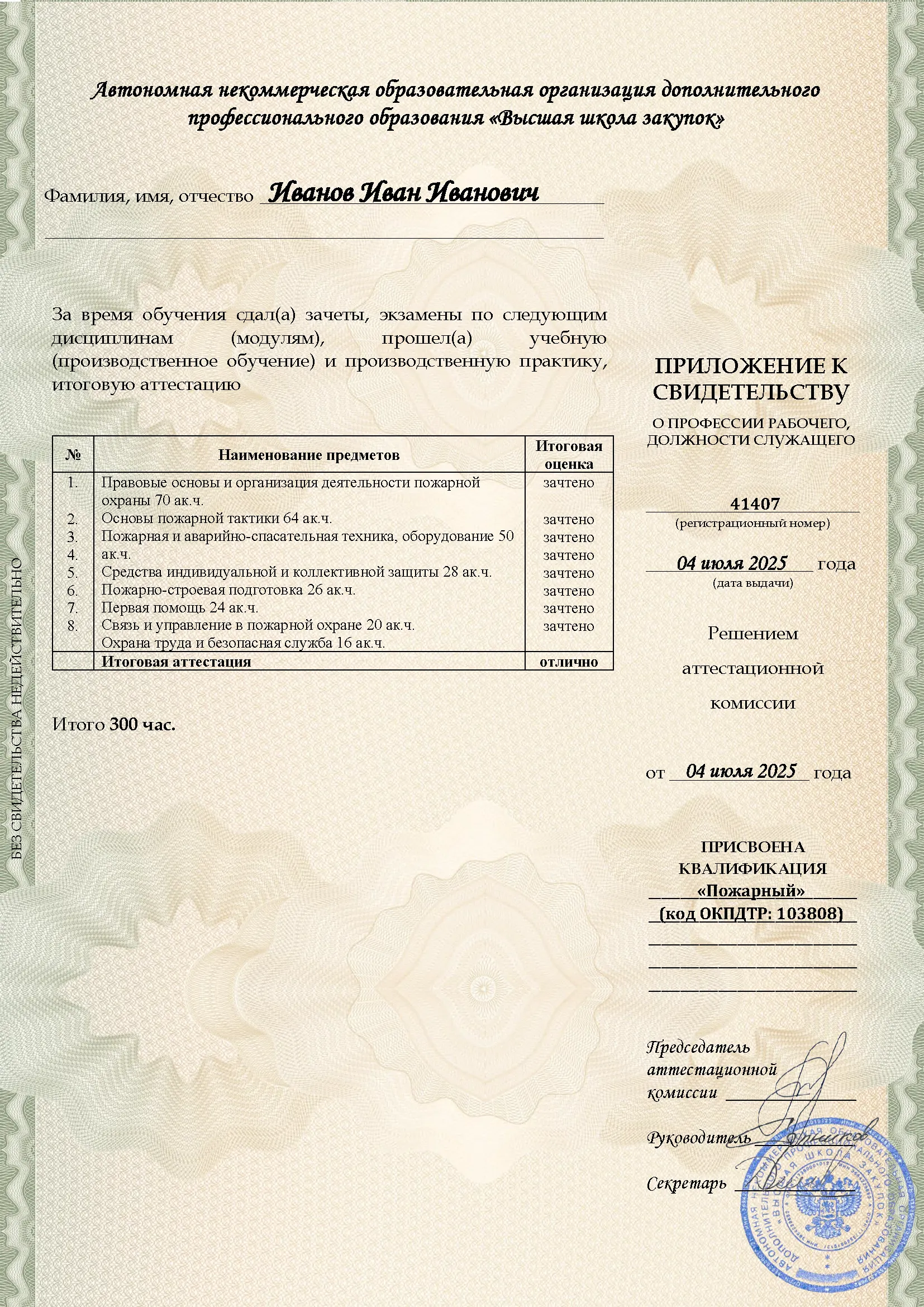 Профессиональное обучение, 300 академических часов, 8 модулей: законодательство и нормативные акты в области пожарной безопасности, тактика тушения пожаров и проведение аварийно-спасательных работ, устройство и использование пожарно-технического вооружения, оказание первой помощи. Онлайн-обучение в в Кирове с итоговой аттестацией.