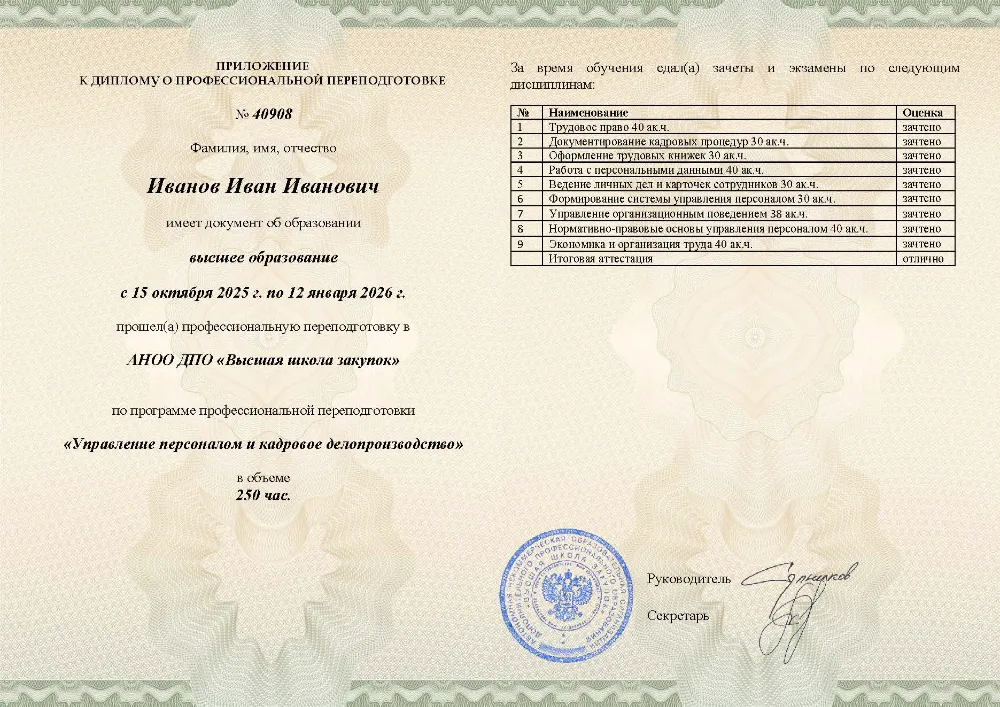 Повышение квалификации, 144 академических часа, 10 модулей: стратегическое кадровое планирование и ситуация на рынке труда, психология управления, документационное обеспечение, развитие, мотивация и вовлеченность персонала, работа с дистанционной занятостью и кадровым резервом. Онлайн-обучение в в Кирове с итоговой аттестацией.