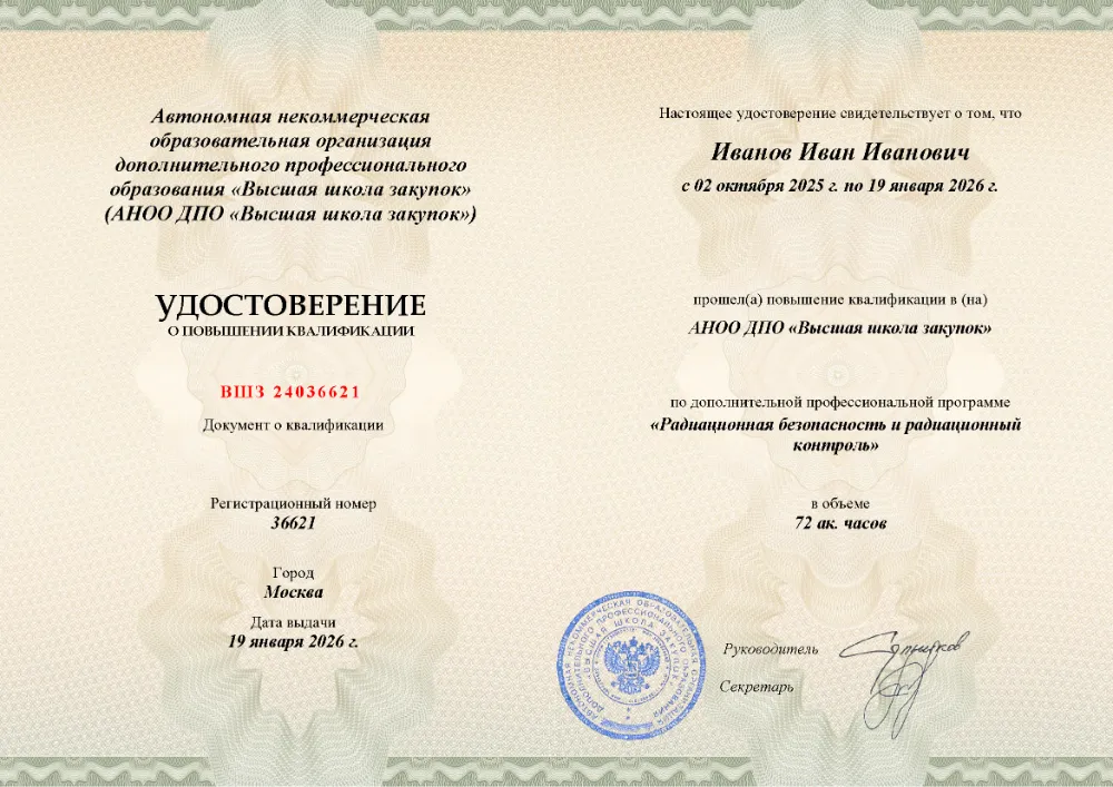Повышение квалификации, 72 академических часа, 7 модулей: правовые и организационные основы деятельности, физические основы РБ и дозиметрия, учет РАВ и РАО, организация производственного контроля, обеспечение безопасности и физической защиты, документационное обеспечение и подготовка персонала. Онлайн-обучение в в Кирове с итоговой аттестацией.